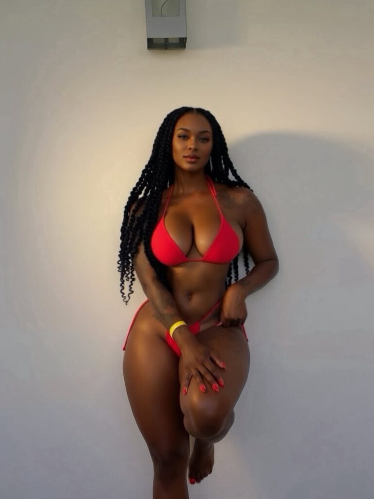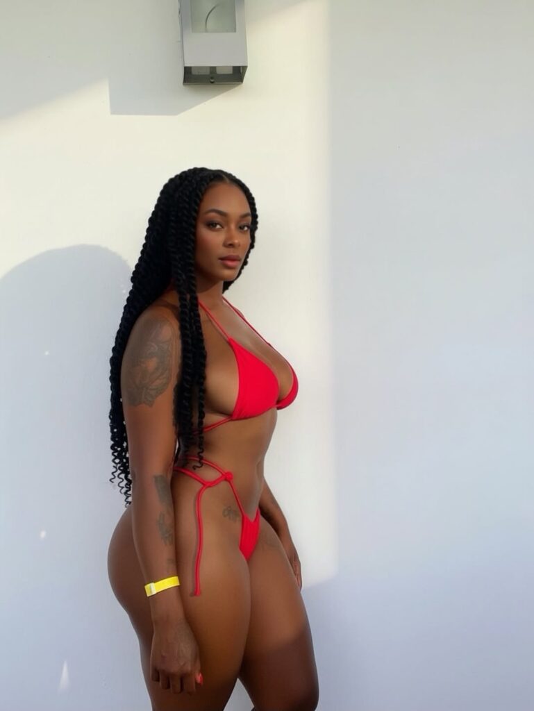 Rocking a fire two-piece swimsuit under that Cali sun, Kristina stepped on location and turned a simple backdrop into a whole vibe. Red on melanin. Clean wall. Golden hour glow. That’s not just a photoshoot — that’s street luxury energy.