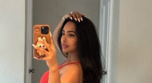 In one frame, she locks eyes with the camera, giving that effortless “headline-worthy” stare—like she just broke the internet and made the front page at the same time. In another, she forms a heart with her hands beneath floating red balloons, bringing a playful softness to the shoot while still owning every angle. That balance? Elite.