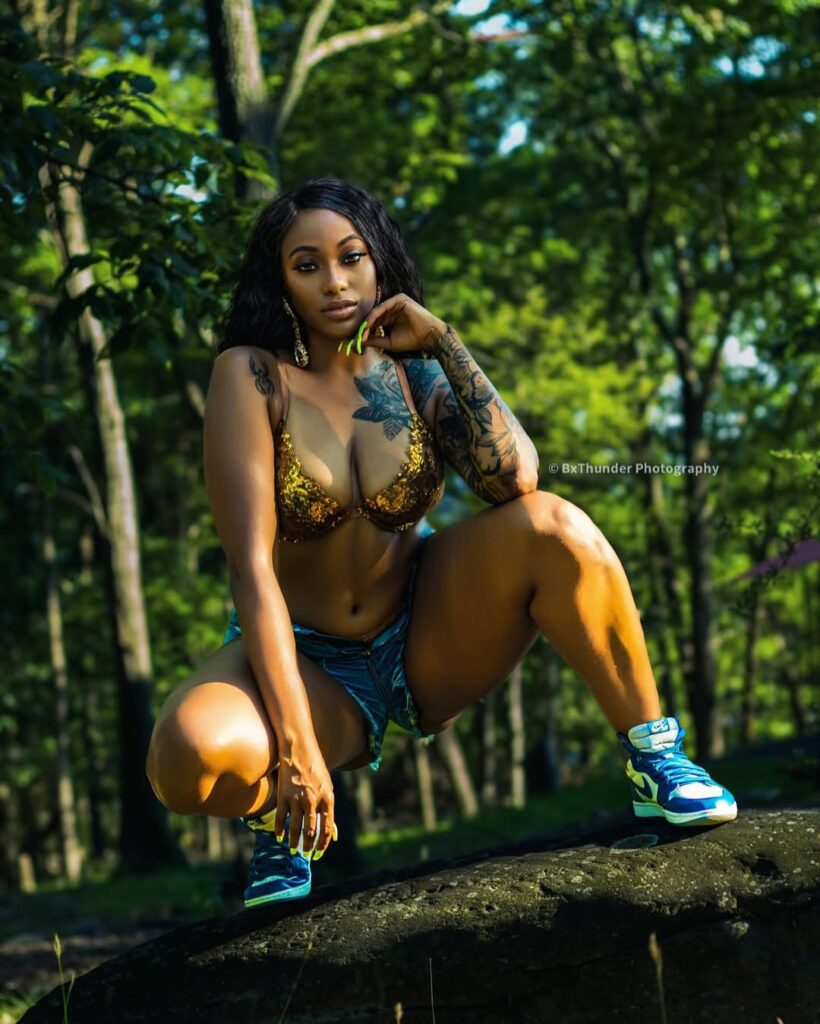 Shot by the talented @BxThunder, the visuals capture every golden ray of sunlight gliding across her skin — highlighting her effortless confidence and undeniable star power. The contrast of the shimmering gold against the earthy tones of the backdrop makes each frame pop, reminding us why Yamidoll continues to reign supreme in the modeling scene.